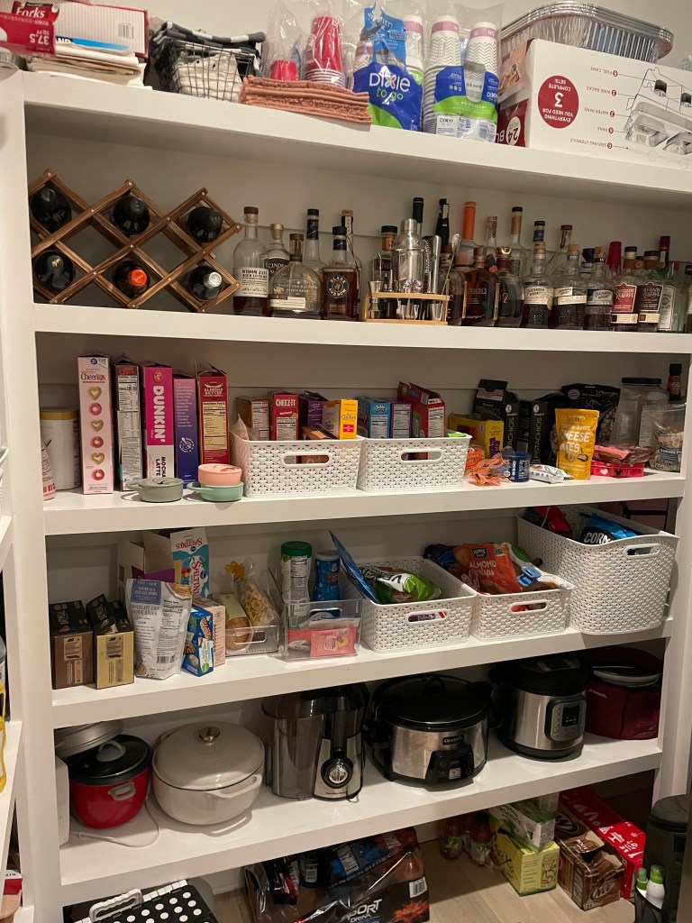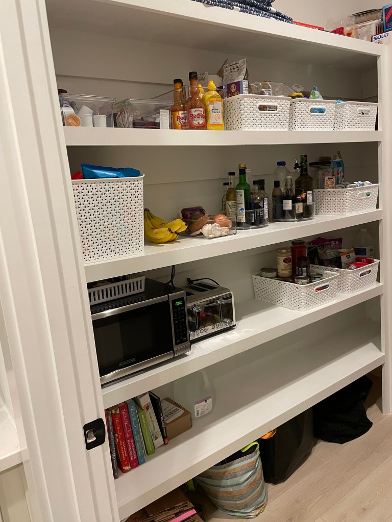 In the end, we were able to utilize their existing containers to recategorize her food items. Working within what her day to day access is, we were able to reset her pantry to allow her children access to some items, while keeping the medicine, and more adult snacks at the top. Grab and go snacks were right in the center, cooking additives easy to see on turntables, and enough room to add more containers or food items if needed.
