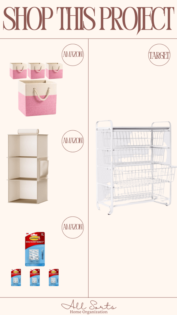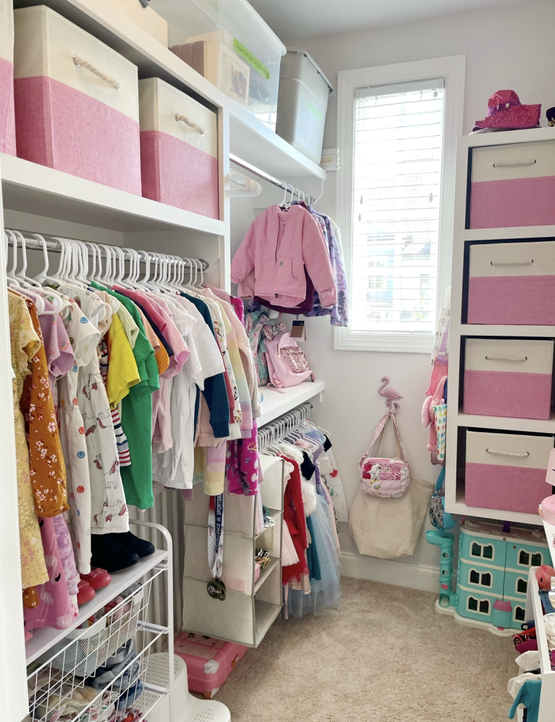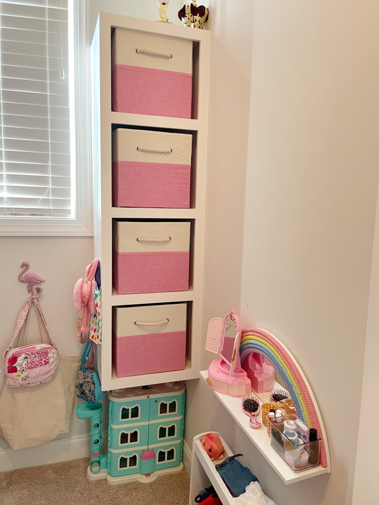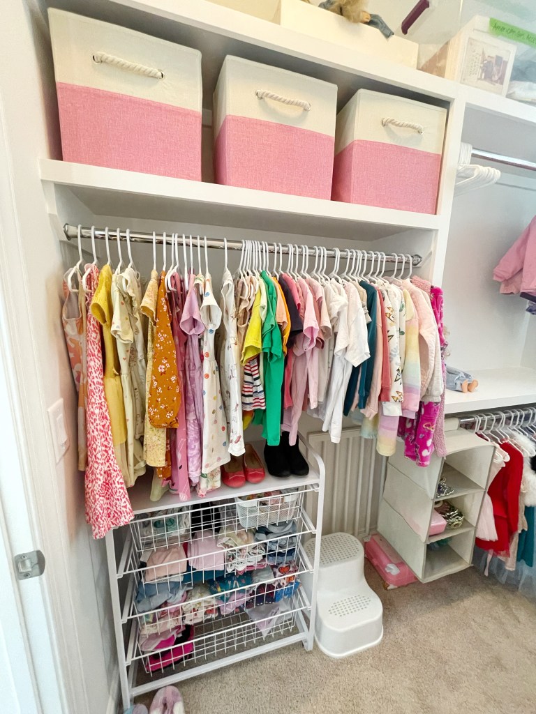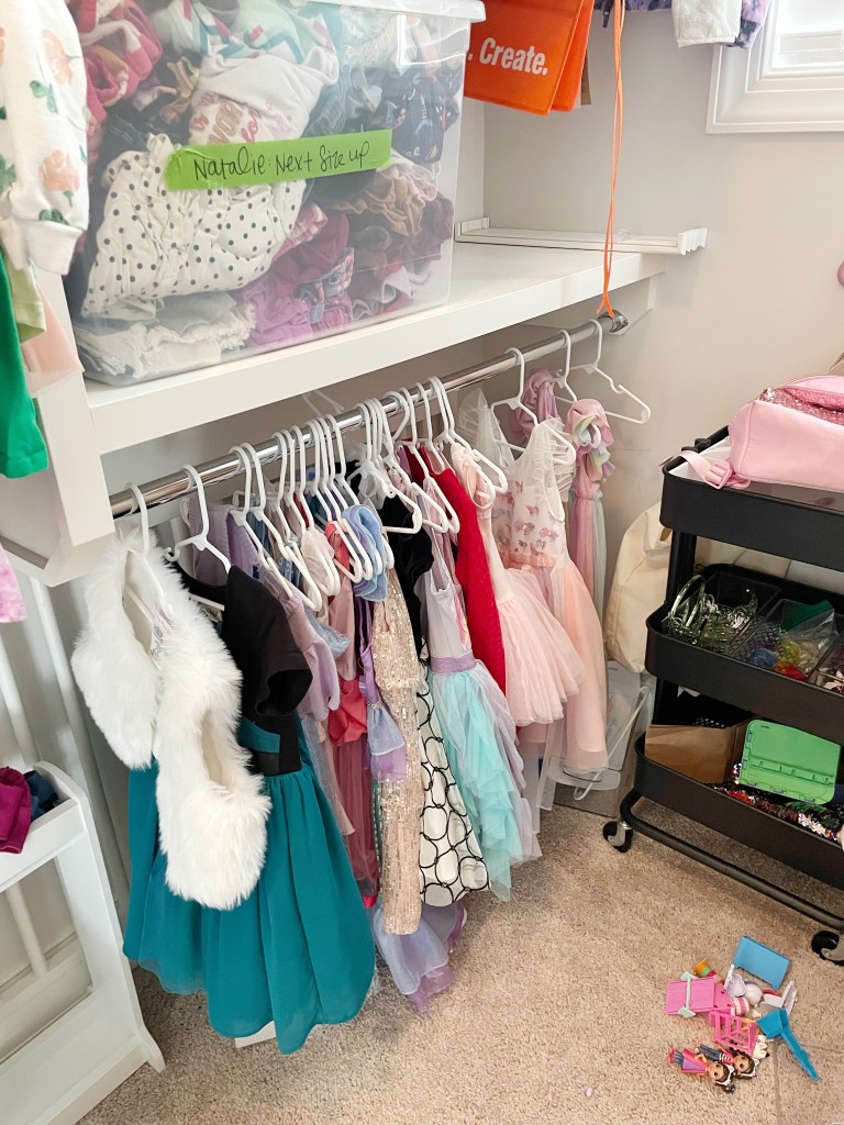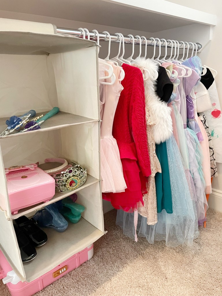 - Created a dress-up section by placing all of her dresses and accessories in one spot, adding in hanging storage